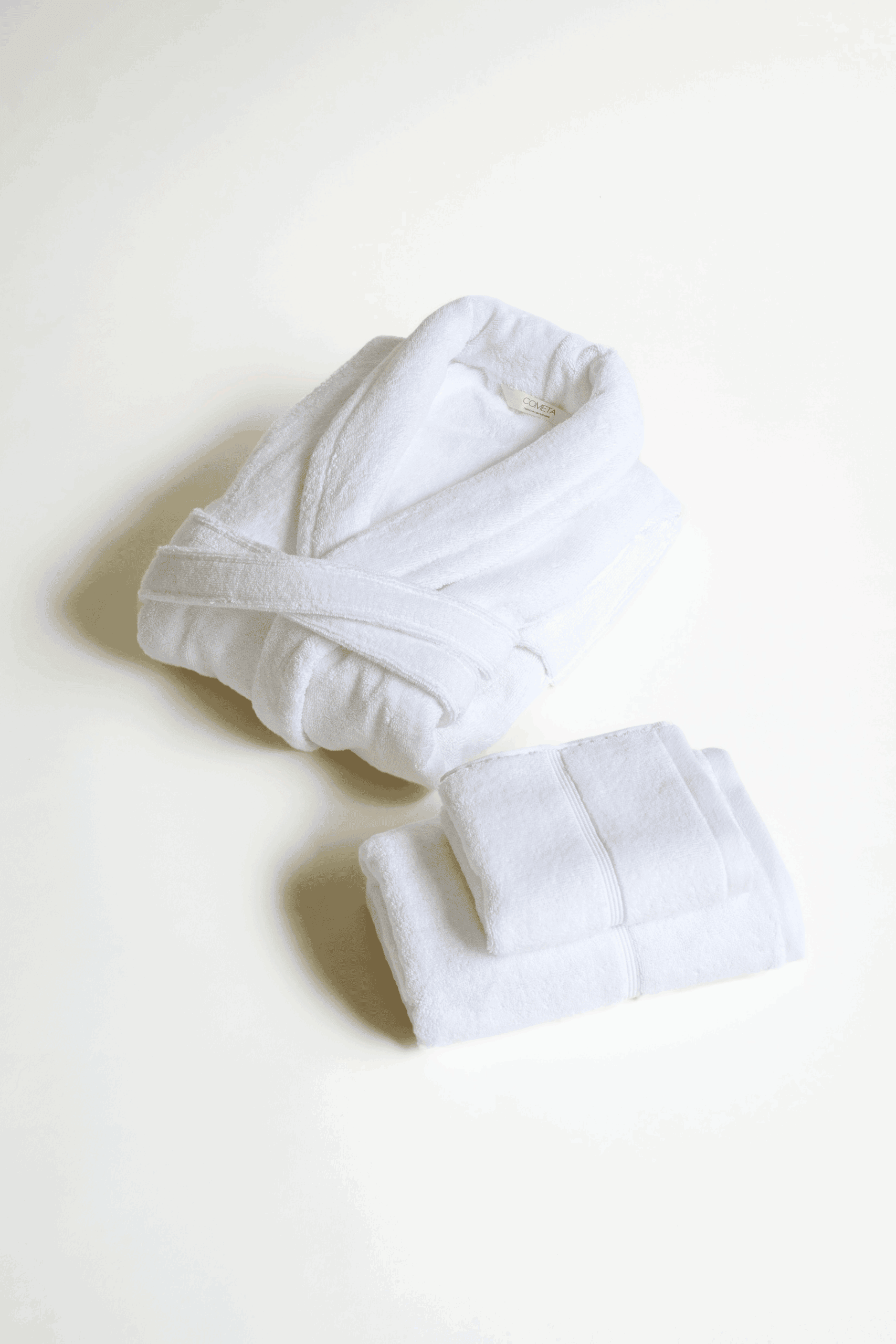 Incluye 1 toalla de cada tamaño, pero en vez de la de baño, lleva albornoz. 100% algodón peinado, de Portugal, un tejido muuuy gordito y suave, pero sin ese tacto aterciopelado que da la sensación de que no seca. Hemos conseguido unas toallas que siguen suaves y mullidas tras los lavados, súper absorbentes y gustosas, ¡dignas de hotel de 5 estrellas!.