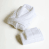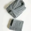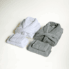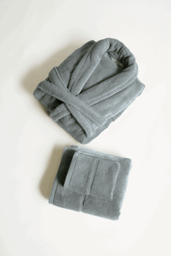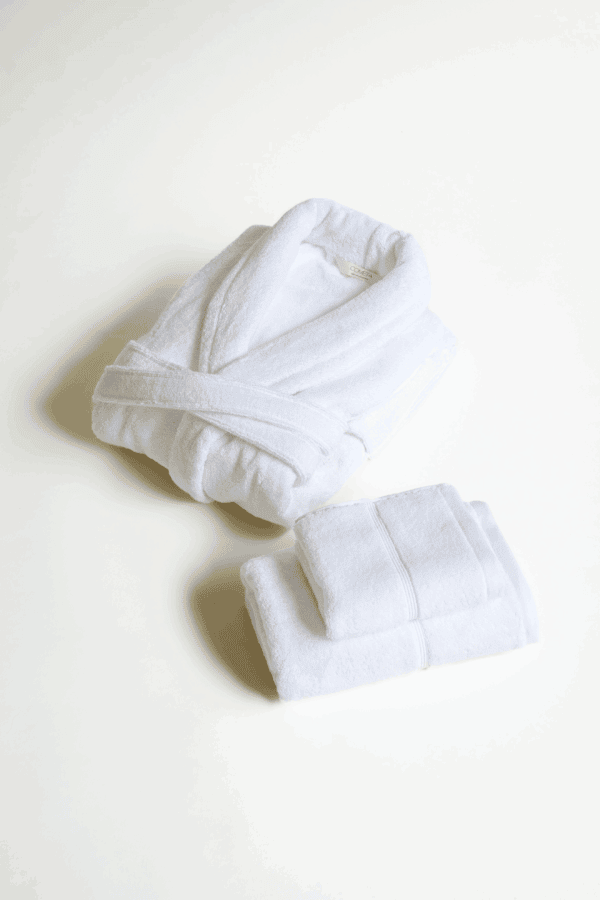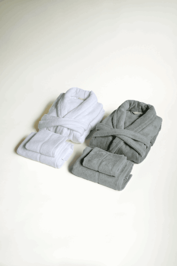 2 sets individuales con albornoz, pero con mejor precio. 100% algodón peinado, de Portugal, un tejido muuuy gordito y suave, pero sin ese tacto aterciopelado que da la sensación de que no seca. Hemos conseguido unas toallas que siguen suaves y mullidas tras los lavados, súper absorbentes y gustosas, ¡dignas de hotel de 5 estrellas!
