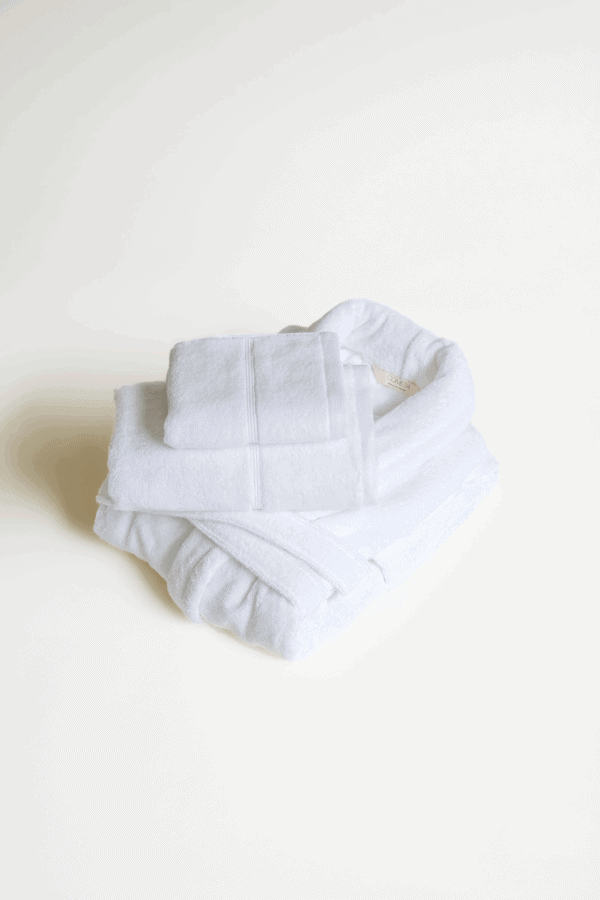 Incluye 1 toalla de cada tamaño, pero en vez de la de baño, lleva albornoz. 100% algodón peinado, de Portugal, un tejido muuuy gordito y suave, pero sin ese tacto aterciopelado que da la sensación de que no seca. Hemos conseguido unas toallas que siguen suaves y mullidas tras los lavados, súper absorbentes y gustosas, ¡dignas de hotel de 5 estrellas!.